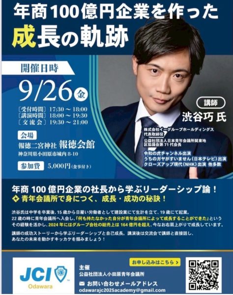 こだま青年会議所様 『成功者から学ぶリーダー論 年商140億令和の虎出演の社長が語る組織の秘密』へ 弊社代表 渋谷巧が登壇いたしました。